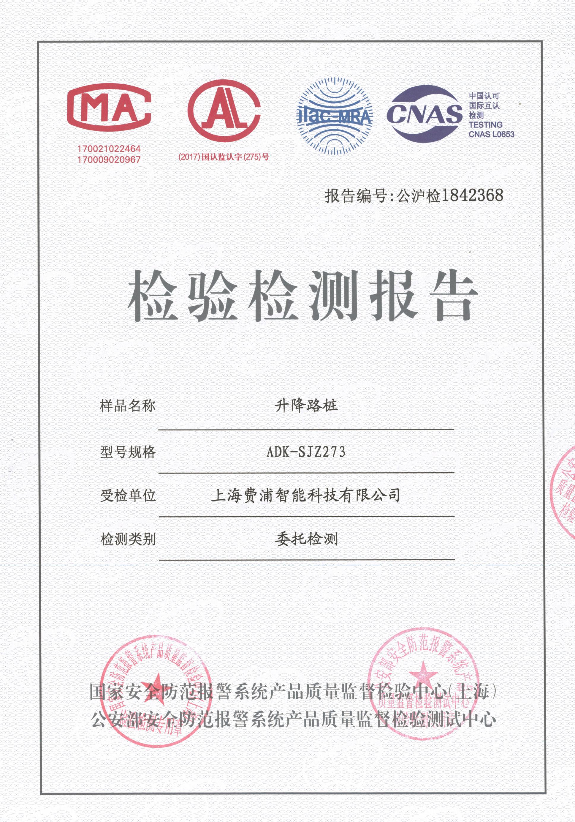 日前,隸屬于公安部第三研究所的國家安全防范報警系統(tǒng)產(chǎn)品質(zhì)量檢測監(jiān)督中心(上海)、公安部安全防范報警系統(tǒng)產(chǎn)品質(zhì)量監(jiān)督檢驗測試中心公布了對全自動液壓升降路樁(ADK-SJZ273)的檢驗結(jié)果,三所從產(chǎn)品外觀、產(chǎn)品質(zhì)量、環(huán)境適應(yīng)性、防護要求、緊急功能等11個檢測項目入手,檢驗受測產(chǎn)品的性能是否符合技術(shù)要求,以確保受檢測產(chǎn)品在交付應(yīng)用中的專業(yè)性、可靠性、安全性。經(jīng)嚴格的技術(shù)審核及檢測,全部符合國家標準及上海市地方安防標準,有多項指標高于國家標準及地方標準,獲得了公安三所頒發(fā)的《檢驗檢測報告》。